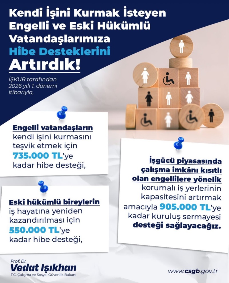 İŞ-KUR tarafından eski hükümlülerin kendi işini kurmalarına yönelik olarak 2026/1. Dönem hibe desteği başvuruları başladı.